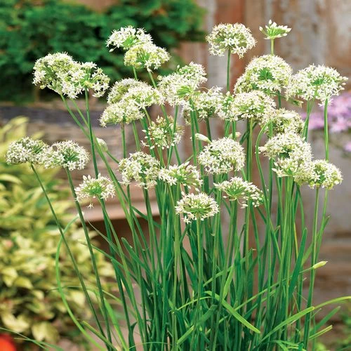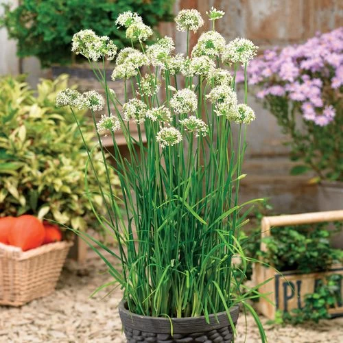 Allium Autumn Bee Attraction, an F1 hybrid, is an edible ornamental perennial plant that’s both beautiful and delicious. An unusual allium, it sets flowers within the first year of sowing and sets flowers in both spring and fall by the second year. Borne on filled, sturdy stems, the attractive rounded flowerheads are full of tiny white blooms that sustain bumble bees and butterflies at a time of year when many other pollinator-friendly plants have passed their prime. Allium Autumn Bee Attraction sets a relatively large number of long-lasting flowers, so there’s plenty for adding to a cut flower arrangement, or two. And the small, tender leaves are edible. They have a mild garlicky flavor and can be used fresh or for cooking.