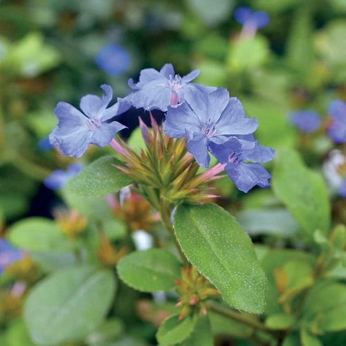 The original late-bloomer, plumbago makes a belated appearance in spring, after most of the garden is well under way. Quickly meandering over rocks and across troublesome bare spots, Blue Plumbago begins blooming in late summer, just as the rest of the flower garden is calling it quits. The peacock-blue flowers are flattish and held wide open, just 3/4-inch across yet very prominent against the small, bright green leaves. As the weather cools, the foliage turns a rich mahogany, enhancing this plant’s appeal.