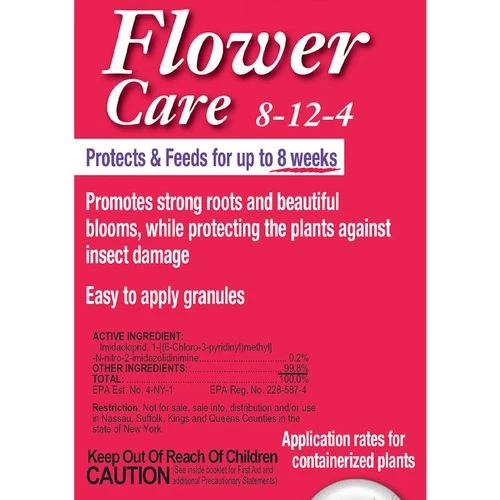 This Bonide product contains a guaranteed analysis of 8% nitrogen, 12% phosphorus, and 4% potassium, as well as generous amounts of micronutrients. The active insecticide is 0.22% imidachloprid, a revolutionary compound that gets absorbed in plants’ roots with the nutrients and protects the plant from the inside out for weeks, including everything from the roots to the new shoots of growth. The 0.22% imidacloprid mixture will not harm plants, and is safe to use around pets.