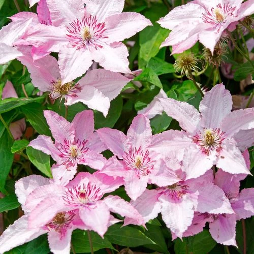 Clematis ‘Hagley’ is a showy, perennial, large-flowered clematis offering midsummer to early fall interest. Long-blooming and free-flowering, the plant sets masses of large, 6- to 8-inch, white to shell pink flowers with a touch of lavender and a frilly center of deep-red anthers. The single, 6-petaled flowers have wavy-edged, recurved petals. The plant blooms on new wood, and at maturity, the vine is fully covered in flowers that attract bees, butterflies, and hummingbirds.