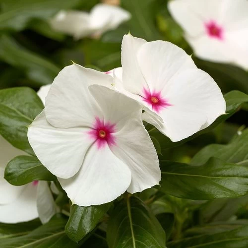 Cora® XDR Polka Dot Vinca is an evergreen tender perennial, usually grown as an annual, that blooms throughout the season, from late spring often until first frost. Highly floriferous, the plant blankets its foliage in large, showy white flowers with a dark rose eye. The flowers attract pollinators, especially butterflies.