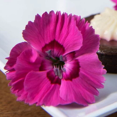 A member of the Dianthus Whetman® American Pie® Collection, Bumbleberry Pie is an herbaceous perennial offering 3 seasons of interest. Blooming continually from spring to fall, the plant sets masses of large (to 2 inches) single blooms. The frilly flowers are saturated rose-pink and have a unique magenta center. Borne in clusters of 3 to 4 and held aloft lush foliage on sturdy stems, the flirty, spice-scented flowers attract bees and butterflies to the garden and make excellent, long-lasting additions to fresh floral bouquets.
