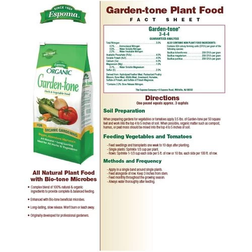 When preparing gardens for vegetables or tomatoes apply 3½ pounds of Garden-tone per 50 square feet and work into the top 4 to 5 inches of soil.