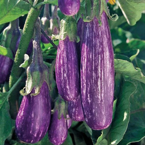 This dwarf reaches just 18 to 24 inches high and wide, setting masses of showy purple-lavender blooms all over its well-branched form. These are followed by eggplants in clusters of 2 to 4. Very slender and long, they are neon-lavender with bold streaks of whiteĀabsolutely showstopping.