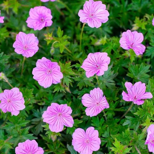 A geranium, commonly called cranesbill, Geranium ‘Blushing Turtle’ is a freely branching herbaceous plant with an upright and rounded habit of deeply lobed foliage and vigorous, low, slow spreading growth. To control spread, side stems can be removed at any time. When massed, it makes a great groundcover in beds and borders, especially around leggy roses. It is also ideal to trail over a retaining wall or spill over the edges of a patio pot.