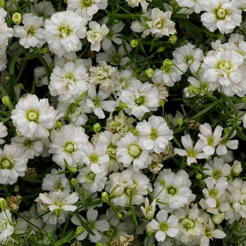This improved variety of Gypsophila Gypsy White will have your garden sparkling. The blooms on the improved flower are semi-double and larger in size. Each flower is tiny, but there are so many and so closely spaced that they form a cloud of soft color. The Gypsophila Gypsy White Improved is perfect for containers, garden beds, small areas, and has better branching and a better growth habit. This flower has a longer bloom season and is great at tolerating the heat.