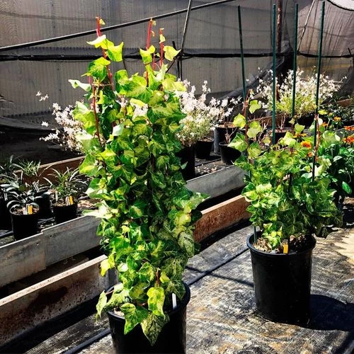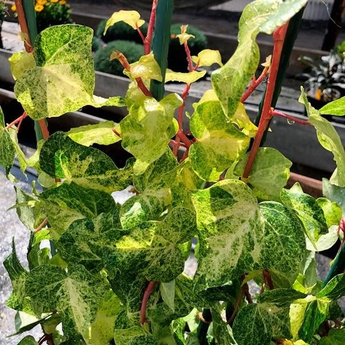 Hedera ‘Tropical Blizzard’, a large-leaved Algerian ivy, is an evergreen perennial offering year-round interest. The unique leaves are highly variegated with gold to pure white marbling and flecking with varying shades of green in between. But the pink and red stems may just steal the show.