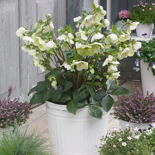A Helleborus hybrid, commonly called Lenten rose or hellebore, Frostkiss Molly’s White is an herbaceous plant with vigorous growth and a bushy, well-branched habit. Shown to best effect when massed or grouped in beds, borders, and patio pots, the plant also makes a lovely ground cover and will naturalize, slowly spreading via rhizomatous roots. It also self-seeds in ideal growing conditions but will not become invasive. It’s ideal for planting under a high-branched deciduous tree or large shrub, protected from strong winter winds.