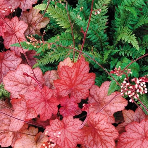 Heuchera ‘Georgia Peach’ is part of the Southern Bell series developed by Terra Nova, and we think it’s the absolute star of the bunch. There is simply no other color blend like it, though many heuchera can make a bid for most dramatic plant in the garden. There is no doubt that it offers terrific contrast to just about every other plant in the shade border, from hosta to fern.