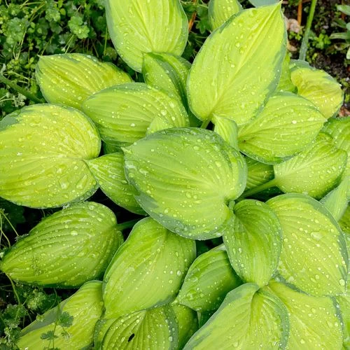 Members of the Hosta genus are commonly called hosta or plantain lily. A sport of ‘Guacamole’, Hosta ‘Stained Glass’ has the same rapid growth rate and mounding habit, but it displays its variegation earlier in spring and maintains a much brighter gold color throughout the season. As with all fragrant hostas, the species Hosta plantaginea is in its lineage. Hosta is a highly versatile plant, shown to best effect when grouped or massed in beds and borders. But it also makes a lovely specimen or container plant as well as nice edging.