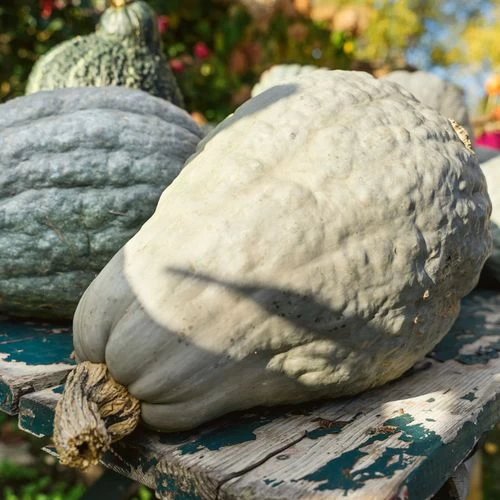 An organic heirloom winter squash, Hubbard Blue is grown as a fruit vegetable. Very productive, the plant sets uniquely beautiful pale blue-hued fruits, approximately 15 to 20 inches long with a 9- to 12-inch diameter, weighing about 15 to 30 pounds each. The shell-necked squash has a hard, coarsely warted rind and thick, smooth, golden flesh with a rich, semisweet, nutty flavor, similar to pumpkin. Roast, bake, boil, or steam. Use in soups, stews, casseroles, breads, and desserts. The seeds also make a delicious and nutritious snack. Winter squash is high in fiber, protein, magnesium, potassium, vitamins B6 and C as well as the carotenoids beta carotene, lutein, and zeaxanthin.