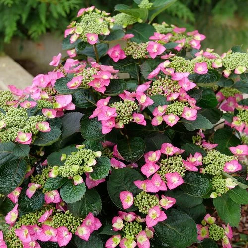 A Proven Winners® ColorChoice® Flowering Shrubs variety, Tuff Stuff Top Fun™, a lacecap mountain hydrangea, is a woody deciduous shrub offering year-round interest. Heavy blooming, it blooms and reblooms continually on old wood from summer through fall. Highly colorful, the lacecap clusters of hot pink or vibrant purple florets “pop” against flushes of dark blue-green foliage, which takes on shades of burgundy in late summer. Although the vibrant flowers make long-lasting cuts for fresh and dried arrangements, left in the garden, they’re a valuable wildlife food source, attracting bees, butterflies, and beneficial insects in summer, and their seeds attracting songbirds in late fall.