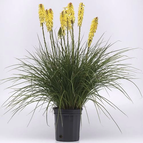 Kniphofia Glowstick is an herbaceous perennial offering 3 seasons of interest, blooming continuously and abundantly summer through fall. Borne on tall, thick scapes, an abundance of terminal flower spikes, dense with clusters of drooping, tubular, bright yellow blooms, rise above a basal tuft of finely textured foliage, which resembles ornamental grass. Nectar-rich, the flowers are irresistible to butterflies and hummingbirds; extremely showy, they are superb cut flowers for summer bouquets.