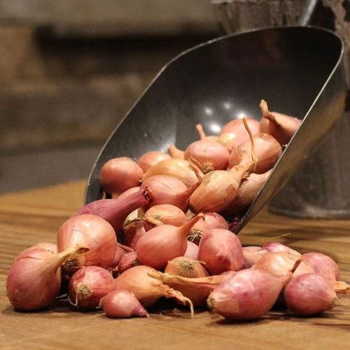 Nero Shallots Hybrid Onion Sets, a hybrid shallot variety, is a bulb vegetable. The plant produces traditional globe-shaped bulbs. The bulbs are 1½ to 2 inches in diameter with red to copper skin, white flesh, and a mild, sweet onion flavor and a fine texture. Use fresh, cooked, or pickle in vinegar and brine. Cured shallots will store for several months. Shallot greens are also used as garnish for soups and sauces. They are rich in minerals, including phosphorus, potassium, calcium, and nitrogen.