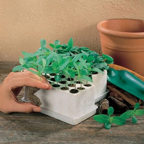 The planting block is constructed of expanded polystyrene, 3 inches tall by 2½ inches wide by 6 inches long, with 18 pre-drilled holes. Into each hole is set a planting cylinder, a sponge-like medium of pasteurized, disease-free peat moss held together with a flexible binder that holds several times its weight in water. When you are ready to start your seeds, simply soak the cylinders in lukewarm water for a few minutes, drop a few seeds into the pre-formed hole in the top of each cylinder, and set the cylinder into the polystyrene planting block. Place the watering tray (sold separately) beneath the block and water from below (which encourages the roots to grow down instead of wrapping themselves around the new seeding.) Place the block in a warm, lighted area. It’s that easy.