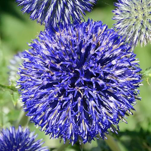 Cold hardy and easy to grow, globe thistle thrives in warm, dry regions, growing best in sunny to mostly sunny locations with poor, dry to medium moist, well-draining soils. But it grows well in a variety of soils, including shallow, rocky soils. But the soil must be well-drained, and if it’s too fertile, the plants will become leggy. Although globe thistle is exceptionally low maintenance, deadheading spent blooms encourages a longer, heavier bloom and discourages any unwanted self-seeding. The plant is deer and rabbit resistant and salt, heat, and very drought tolerant.