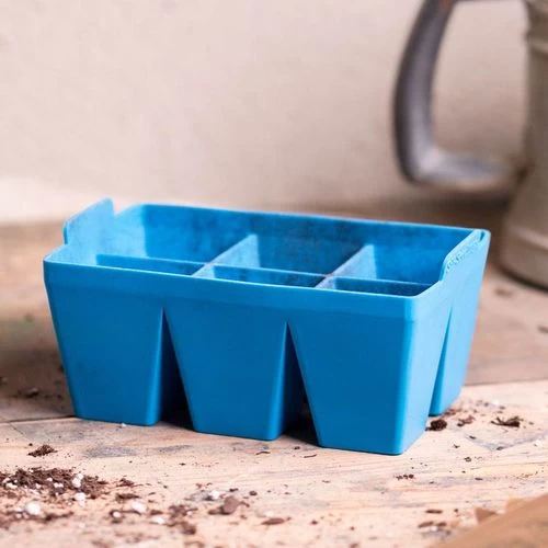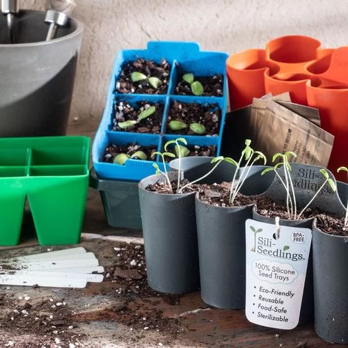 Choose between Sili-Seedlings 6-Cell Seedling Trays in sapphire blue or emerald green and 10-Cell Seedling Trays in carbon grey or canyon red.