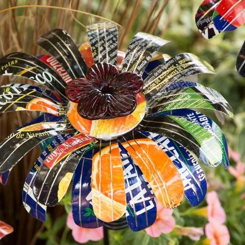 This flower is made from a recycled tin can, with overlapping petals and bright colors that will capture the attention of more than just the birds. The top of a blown-glass vessel extends through the top of each metal blossom, while the majority stays hidden underneath. A single feeding portal is created by a red, blown-glass flower that fits into the neck of the nectar reservoir. The tin can bloom shades the nectar from the sun, which helps prevent the nectar from spoiling. The vessel fits easily into the long, stem-like stake.