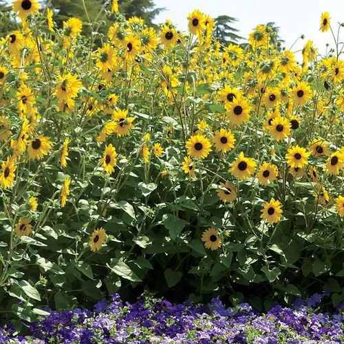 Plant Sunfinity® Yellow Dark Center Sunflower Seeds in spring, and in summer, the plant blooms in 4-inch flower heads with bright yellow rays surrounding a dark brown center. Borne in clusters on stiff, course stems, the blooms continue over a long season, up to 12 weeks, and last a long time in a vase. Be sure to cut sunflowers in the early morning to encourage longer-lasting blooms.