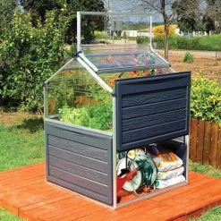 The Plant Inn Coldframe and Shed is a combination raised bed, coldframe, and storage area. Beneath the A-frame roof there is a big planting area, 46 inches wide and long, with 2 deep planting trays, each individually irrigated. Greenhouse SnapGlas™ protects the plants from UV rays, rain, cold, and hail, as well as keeping the planting area warm and well lighted, while 2 adjustable vents offer plenty of cross-circulation.