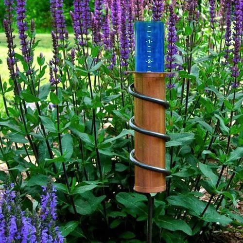 The solid copper flute collects the water, and the extremely durable blue polycarbonate measuring tube with a calibrated float sits down inside the flute. As water fills the flute, the blue tube floats up, displaying the measurement. Ha! You can see it at a glance, even from far away . . . but you might want to move closer, because the spiral copper design and the bright blue of the tube are both worth a second look, just for their beauty.