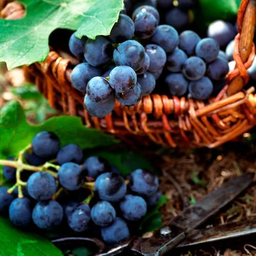 A French-American hybrid, Vitis ‘Frontenac’ Blue Grape is a woody deciduous grapevine that’s ornamental as well as productive, prized for fruit and foliage. The vine blooms in tiny yellowish-green flowers in mid to late spring followed by medium-sized clusters of bluish-black fruit, harvestable late season, from late summer to late fall. The grapes are used to produce dry red wine, rose, and port. The grapes have high sugar and high acidity and may require malolactic fermentation during winemaking. Frontenac wines have a bold cherry flavor with blackberry, blackcurrant, and plum notes, which make them great dessert wines.