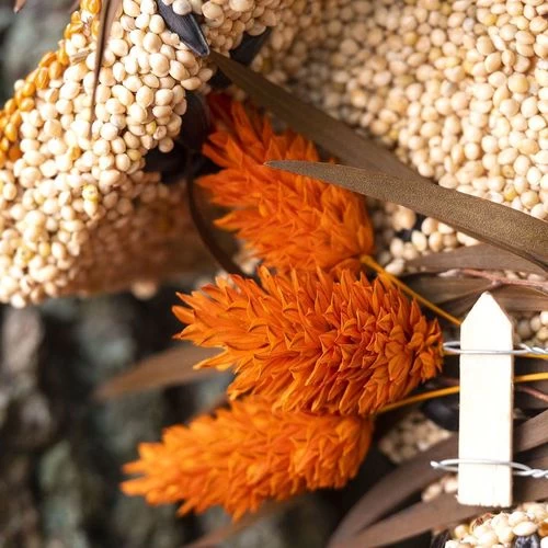 The seeds on the thoughtfully designed, handmade wren house were chosen for their appeal to a wide variety of birds. The casita is sized for smaller bird species that benefit from the extra protection the birdhouse offers. Sprigs of dried grasses and a colorful butterfly replica shield the entry and naturalize the birdhouse for its new occupants. When you give the Wren Birdseed Casita, whether for a graduation, anniversary, birthday, or any joyful occasion, your recipient will appreciate its usefulness and your thoughtful gift will delight for many seasons.