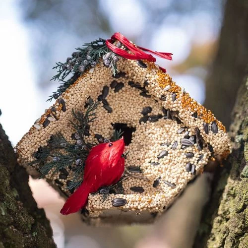 Providing a food source near birdhouses makes the lodgings much more attractive to birds. And the Wren Birdseed Casita is simply smothered with premium seeds, beckoning to birds, inviting them to come and stay awhile. Sprigs of juniper berries, a whimsical cardinal, and bright red raffia bow add to its allure.